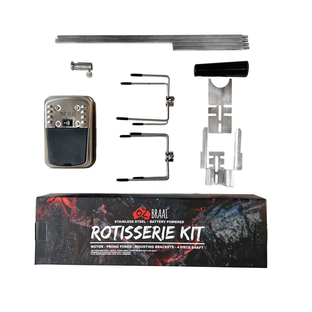 Introducing our premium Rotisserie Kit, a true game-changer for braai enthusiasts and culinary aficionados alike. Each element of this kit has been meticulously designed, promising not only a seamless roasting experience but also culinary outcomes that are a cut above the rest. From the efficient motor that promises even cooking to the versatile shaft extensions, our kit redefines the art of roasting while travelling.